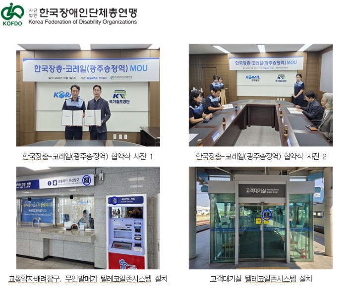 주)한국철도공사 광주송정역은 역사 내 교통약자배려창구와 무인발매기, 플랫폼의 고객대기실에 청각장애인의 편의 제공을 위해 사)한국장애인단체총연맹의 지원을 받아 텔레코일존시스템을 설치 운영을 위한 MOU체결 행사를 10월 1일(수)에 진행하였다고 밝혔다.